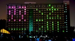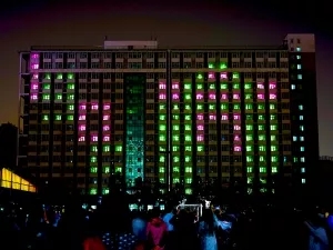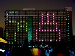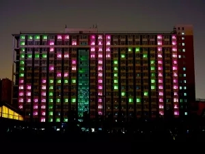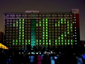 中国农业大学学生公寓楼举行“亮灯”活动,成为同学在重大节庆活动时候的保留节目。2017年10月15晚,校庆主题的亮灯活动上演: