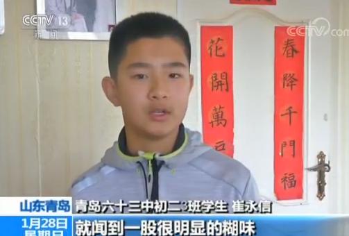 青岛六十三中初二3班学生 崔永信:我在敲到三楼的时候就闻到一股很明显的糊味,味挺大的,我就回家拿了手电筒和电话。