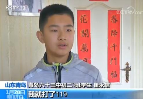 青岛六十三中初二3班学生 崔永信:发现他们家厨房烟特别明显,很浓,天花板都有点变色了,我就打了119,我把我妈妈和邻居都叫下来了。