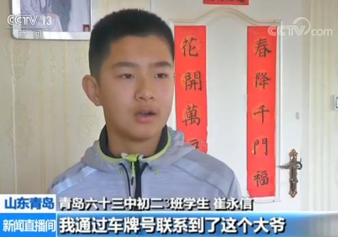 青岛六十三中初二3班学生 崔永信:我记着大爷(302住户)的车牌号,我通过车牌号联系到了这个大爷,大爷正在附近吃饭,说马上赶回来。