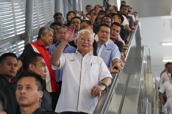 资料图片:在马来西亚加影,马来西亚总理纳吉布(挥手者)参观新建成的捷运站(2017年7月17日摄)。新华社/美联