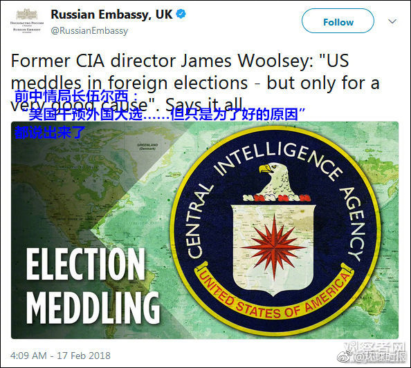 美国中央情报局(CIA)前局长詹姆斯·伍尔西周五(16日)在接受福克斯新闻采访时,伍尔西被问到美国是否会干预其他国家的大选,他说:“好吧,但理由是好的,这仅仅是为了民主的利益。”“噢,可能吧,但是那只是为了他们好。”