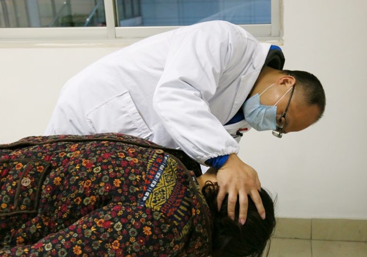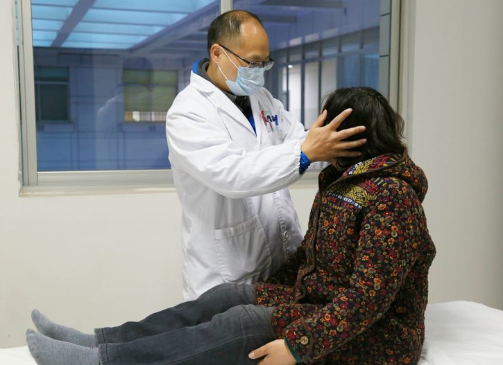 (长沙市第三医院耳鼻喉科医师易恩欢正在用手法治疗为患者汤女士进行耳石复位)