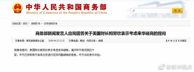 新华网北京4月24日电 商务部网站消息,有媒体提问:美国财长姆努钦表示考虑来华磋商,请问中方有何回应?答:中方已收到美方希来北京进行经贸问题磋商的信息,中方对此表示欢迎。 (据新华社“新华视点”微博报道)