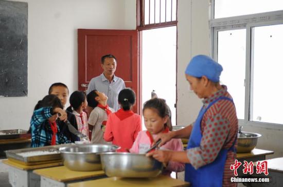 资料图:乡村教师杨迅在食堂里和学生一起排队吃午餐。中新社记者 贺俊怡 摄 “乡村教师支持计划”三年 五大盲点待补