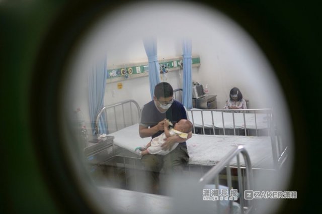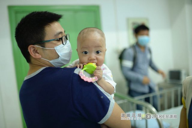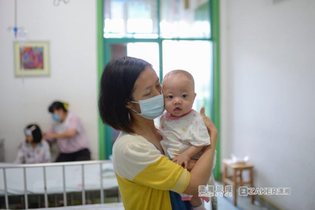 △ 7 月 6 日上午,在湖南省儿童医院普外一科肝移植病房,向女士抱着 8 个月大的儿子楠楠,楠楠不时地挥动着双臂,对妈妈微笑。