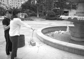 周菊梅听到丈夫的抱怨,决定下楼向物业投诉。她走向小区门口的保安岗亭,向一名保安反映了情况。这名保安随她一起赶到6栋旁的圆形活动广场。