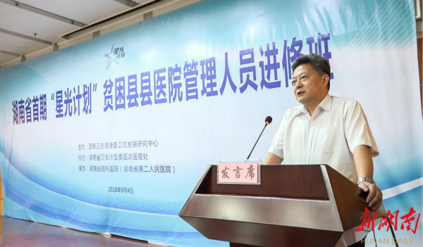 华声在线9月4日讯(新湖南客户端·华声在线记者 李传新 通讯员 石荣)由国家卫生健康委卫生发展研究中心主办、省卫生计生委医政医管处协办、省脑科医院承办的全省首期“星光计划”(全国优质医疗卫生服务促进项目)贫困县县医院管理人员进修班今天开班,全省48个贫困县共计200余名医院管理者参加,共同探讨县级医疗卫生服务能力提升问题,助力健康扶贫工程。