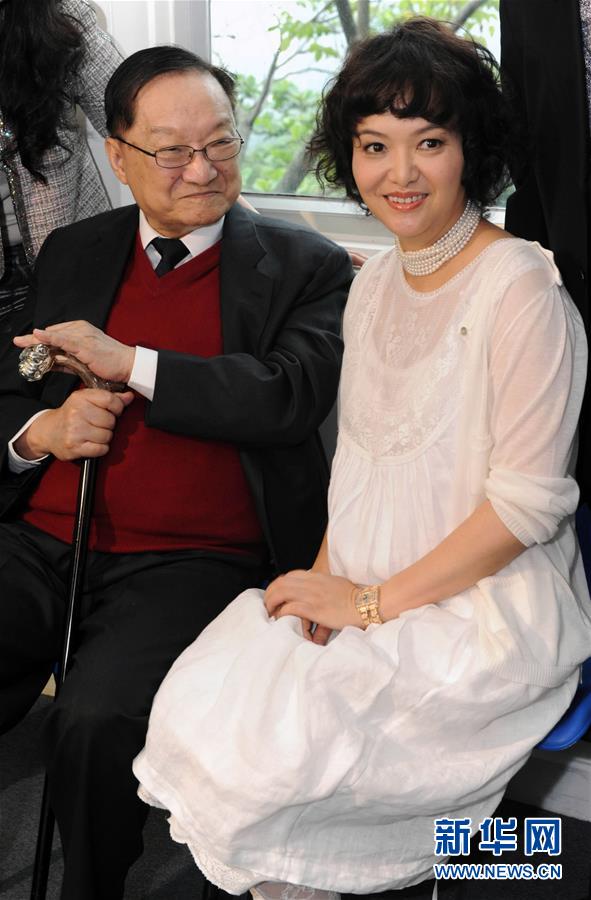 这是2011年5月15日,金庸(左)在香港视觉艺术中心参加女儿查传讷个人画展。 新华社记者 宋振平 摄