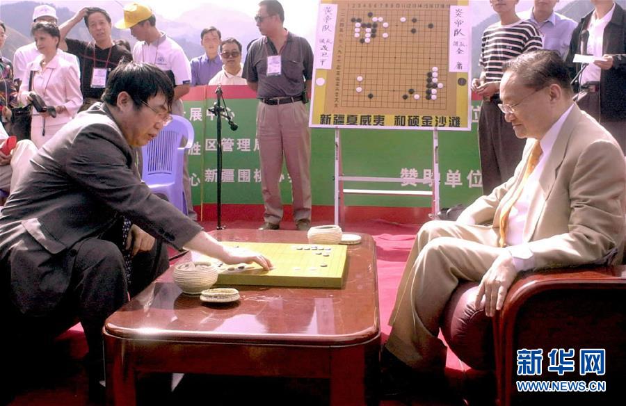 这是2001年8月5日,金庸(前右)与聂卫平(前左)在新疆天池畔对弈。 新华社记者 罗晓光 摄