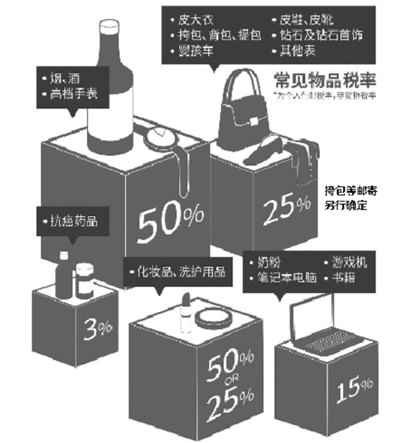 北青报记者注意到,在此轮行邮税调整中,包括中国消费者最热衷“海买”的酒、烟、纺织品、箱包、鞋靴、钟表、化妆品、家电、摄影(像)设备、影音设备等259个税目的常见日用消费品都在降税之列。这些消费品的税率分别从30%和60%下调至25%和50%。其中,烟、酒、玉石、高档手表和化妆品的税率降幅达到10%。此外,“挎包、背包、提包”原来邮寄是按200元单价定额计税,此次调整为“另行确定”;CD、VCD、DVD等光学媒体统一在新增税目“光学媒体”下,税率定为15%;10元/毫升(克)或15元/片(张)及以上的护肤类化妆品调整为“高档护肤类化妆品”税目,税率调至50%;其他非高档护肤类化妆品税率则下调至25%。