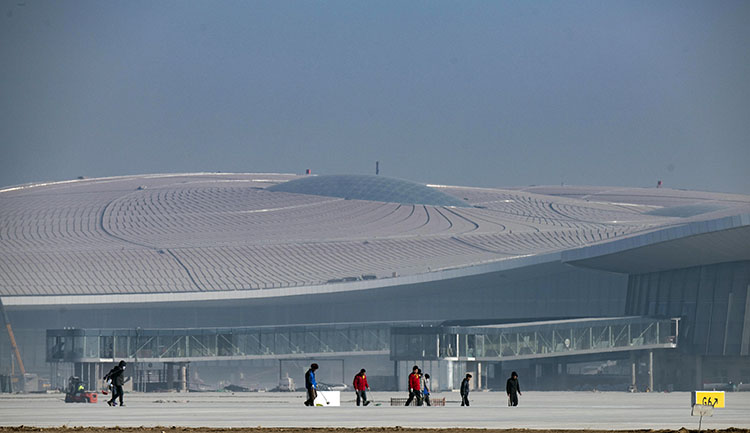 目前,大兴机场三纵一横四条跑道已全面贯通,正式启动助航灯光调试;航站楼屋顶装饰板铺装完成,成功点火热源工程,顺利保障航站楼冬施供暖;停车楼亮灯计划圆满完成,工作区进出场高架桥全线通车;综合交通体系建设稳步推进,五纵两横主干路网也逐步成形。