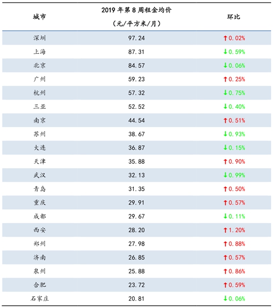 2019年第8周20个重点城市租金价格小幅上涨