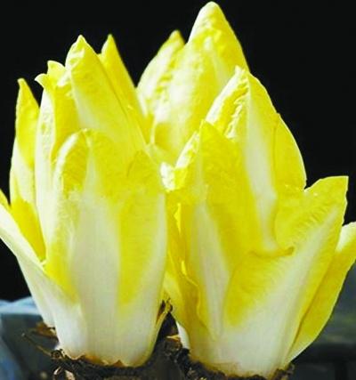 用菊苣根部来培养软化的芽球,色呈黄白,略似中国大白菜。由于不见光,叶片入菜,口感极为纤细软嫩。