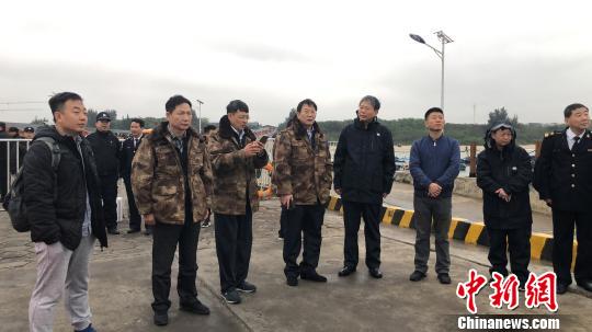 广西壮族自治区区副主席费志荣(右四)、北海市市长蔡锦军(左四)等官员在涠洲岛西角码头指挥救助工作。 王国全 摄