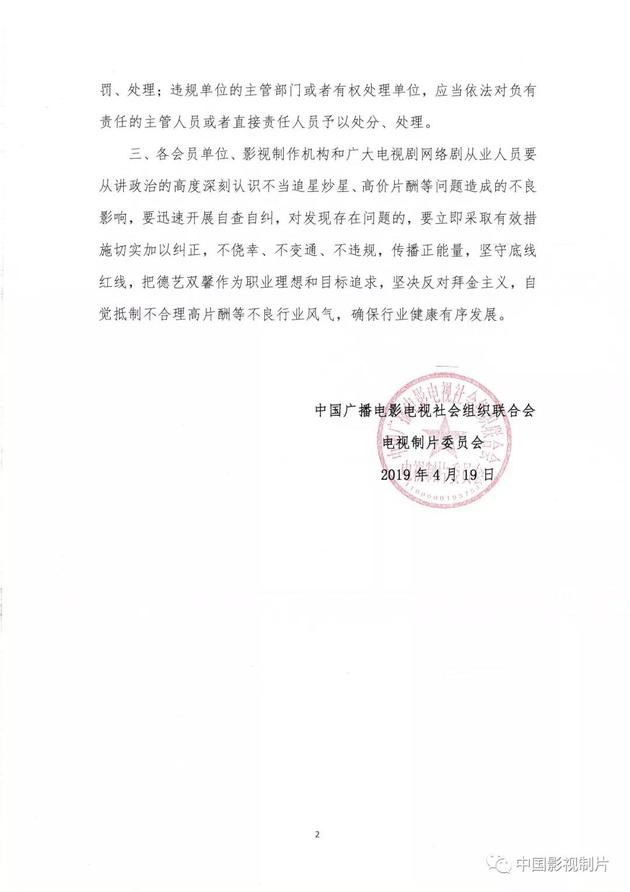 @中国日报网4月22日消息,4月19日,中国广播电影电视社会组织联合会电视制片委员会发布《关于严格执行电视剧网络剧制作成本配置比例规定的通知》,再次强调从业人员严格执行限薪政策。要求全部演员的总片酬不超过制作总成本的40%,其中主要演员不得超过总片酬的70%。若片酬情况不符合规定且无正当理由或隐瞒不报的,所属协会需上报国家广播电视总局,视情况依法采取暂停直至永久取消剧目播出、制作资质等处罚措施。