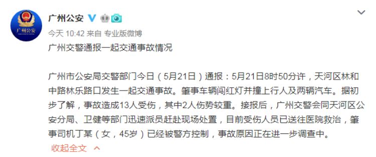 广州市公安局交警部门今日(5月21日)通报:5月21日8时50分许,天河区林和中路林乐路口发生一起交通事故。肇事车辆闯红灯并撞上行人及两辆汽车。据初步了解,事故造成13人受伤,其中2人伤势较重。接报后,广州交警会同天河区公安分局、卫健等部门迅速派员赶赴现场处置,目前受伤人员已送往医院救治,肇事司机丁某(女,45岁)已经被警方控制,事故原因正在进一步调查中。