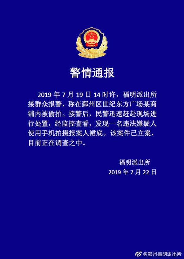 7月22日中午,浙江省宁波市公安局江东分局福明派出所官方微博发布警情通报称,7月19日14时许,福明派出所接群众报警,称在鄞州区世纪东方广场某商铺内被偷拍。民警赴现场查看监控发现,一名违法嫌疑人使用手机拍摄报案人裙底。 该案件已立案,目前正在调查之中。
