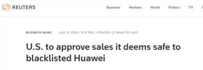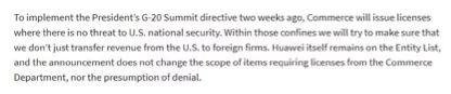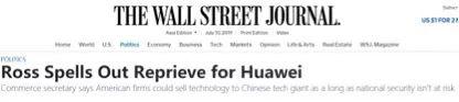 美国商务部官方网站也确认了此事。在该网站刊登的一份发言稿中,美国商务部部长罗斯表示他将给那些“不会对美国国家安全构成威胁”的与华为的生意颁发许可,并称此举是为了落实两周前美国总统特朗普在日本大阪G20峰会上对中方做出的承诺。