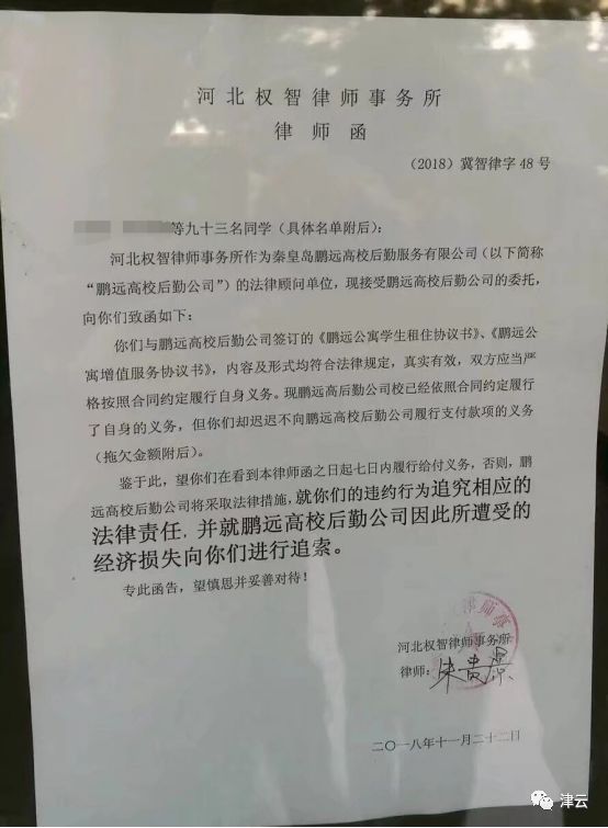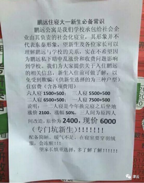 朱玲(化名)是东秦一名大四学生,她告诉记者,鹏远公寓的宿舍价格曾经大幅上涨,“我所居住的四人间,原来是2400元/年,现在涨到了3000元/年,而且是强制涨价,所以同学们也不是第一次对高额住宿费表示抗议了。”她告诉记者,此前有大量学生拒缴住宿费,鹏远的工作人员采取上门催缴、拉闸断电、向学生出示律师函等各种手段逼迫学生缴纳费用。