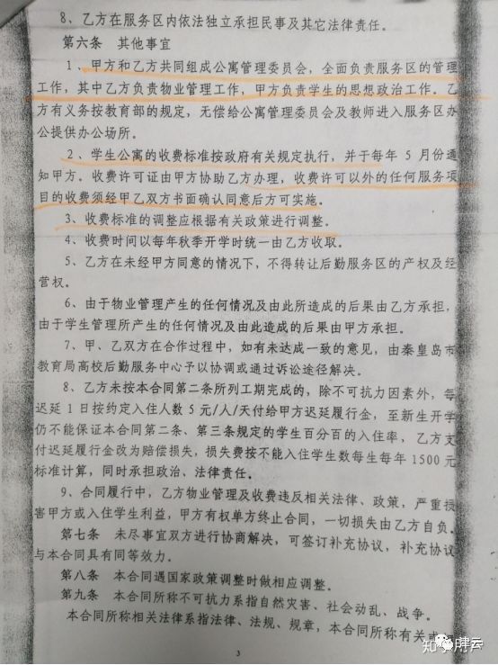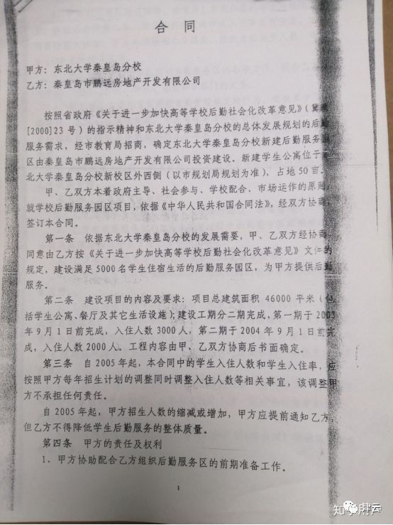 此前媒体报道称,东秦与鹏远集团合作始于2002年。记者在某网络问答社区看到一份合同的照片,其中显示,鹏远公司投资建设一个能供5000名学生生活的宿舍。作为交换,鹏远公司负责学生宿舍的经营,宿舍建成后,东秦还必须保证鹏远公寓100%的入住率,否则学校要以每人1500元的标准给鹏远赔偿。此外,合同显示,学生公寓的收费标准按政府有关规定执行,“收费许可以外的任何服务项目的收费须经甲乙双方书面确认同意后方可实施。”