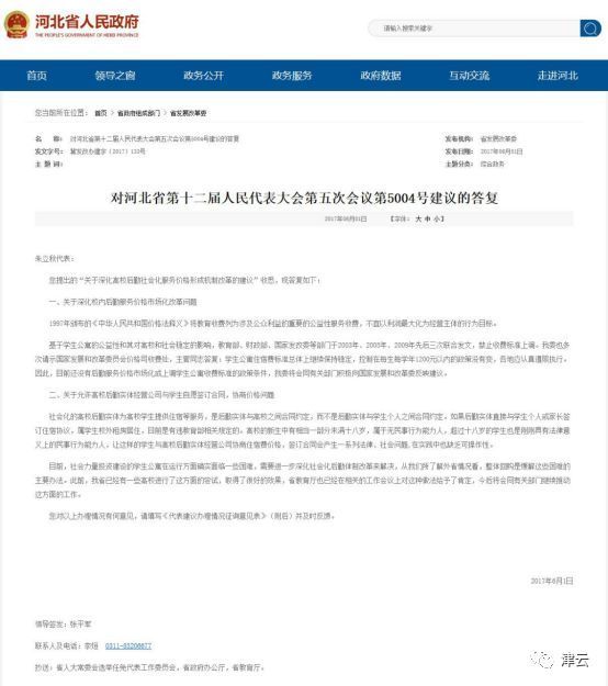 据河北省人民政府网站显示,朱立秋曾提出“关于深化高校后勤社会化服务价格形成机制改革的建议”,河北省发改委2017年6月回复称,“目前还没有后勤服务价格市场化或上调学生公寓收费标准的政策条件。”