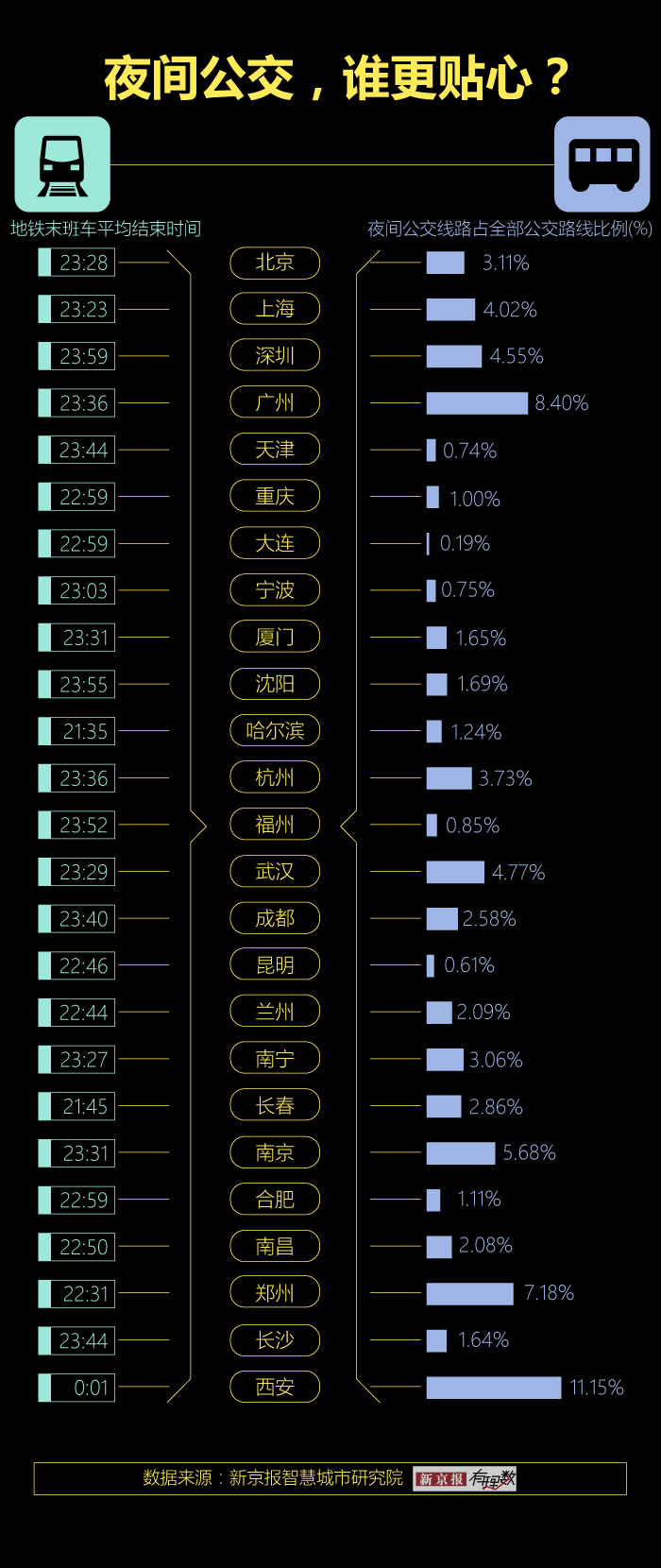 从夜间公共交通来看,西安似乎表现得最好。地铁末班车平均结束时间已过零点,夜间公交线路占全部的比重超过 11% ,排在后面的广州,跟它的差距也不是很大。