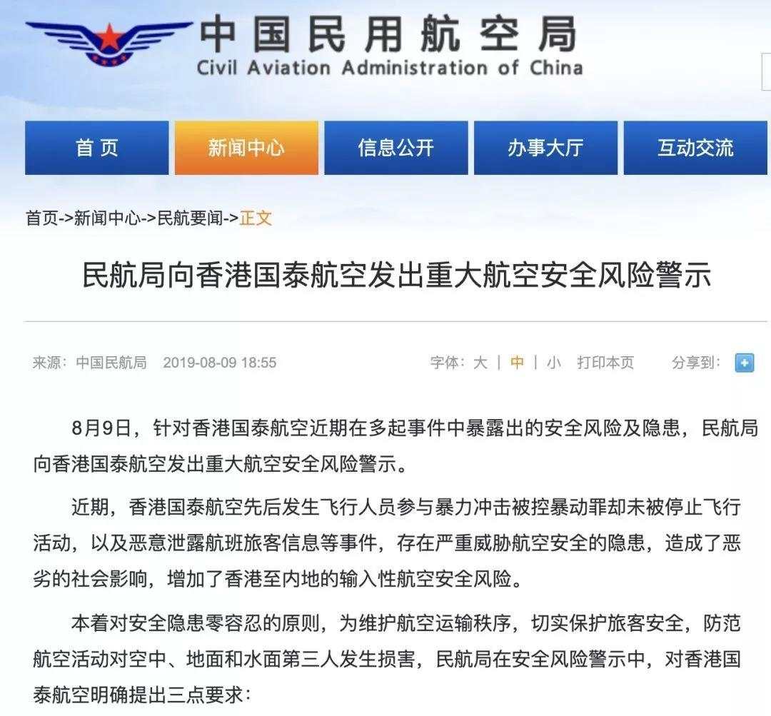 中国民航局发出重大航空安全风险警示,提出三点明确要求。核心是:乱港分子,就别执飞内地了。支持“港独”的,内地不接收其航班。考虑到香港被深圳、珠海、惠州三地环绕,绕过内地执飞?几乎不可能,此招一出,等于掐断了国泰航空的“经济命脉”。