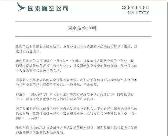 国泰航空开始了“自救三联”:停飞涉暴力事件飞行员,解雇两名行为不当员工、向内地提供机组名单。