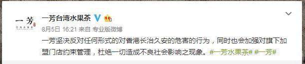 8月5日,这家名为“一芳水果茶”在香港的店铺,不仅以“休业一天”的方式,“声援”香港非法示威举动。某分店官微还在互联网上,公然宣称“反对‘一国两制’”。