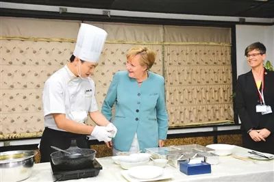 △2014年7月,默克尔在成都一家餐厅学习川菜宫保鸡丁的做法