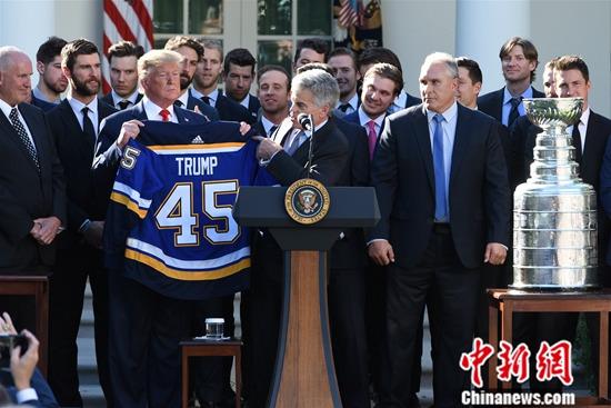 当地时间10月15日,美国总统特朗普在白宫会见北美职业冰球联盟(NHL)总冠军——圣路易斯蓝调队。蓝调队在NHL2018-2019赛季获得球队历史上首个总冠军。中新社记者 陈孟统 摄