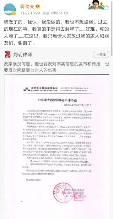 而2018年,蒋劲夫曾被曝光对自己的日本女友家暴。对此,蒋劲夫26日晚在微博中回应,“我做了的,我认。我没做的,我也不想被冤。过去的现在的事,我真的不想再去解释了……”