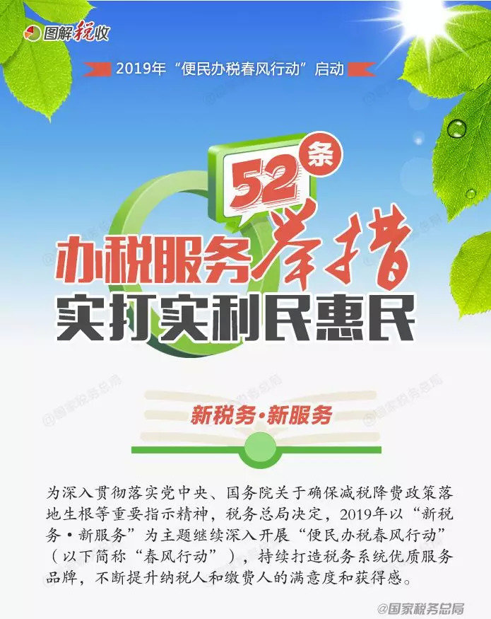 2019年以“新税务•新服务”为主题继续深入开展“便民办税春风行动”,出台4大类13项52条便民办税服务举措,持续打造税务系统优质服务品牌,不断提升纳税人和缴费人的满意度和获得感。