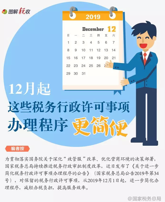 为贯彻落实深化“放管服”改革、优化营商环境,税务总局持续推进税务行政审批制度改革,发布《公告》进一步简化税务行政许可事项办理程序、部分税务行政许可文书和报送材料。压缩办理时间,对部分税务行政许可事项在20个工作日的法定办结时限基础上明确了更短的承诺办结时限;简并申请文书,减少填报事项,合并申请表单;减少对纳税人延期缴纳税款的核准事项的申请材料和对纳税人延期申报的核准事项的申请材料;简化送达程序,实行更加便捷的送达和签收方式等,减轻了纳税人办税负担,提高了税务部门服务效率。