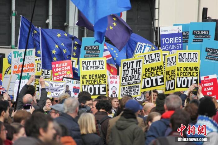 资料图:2019年3月23日,欧盟同意英国延迟脱欧、英国脱欧前景不明之时,伦敦市中心举行了示威游行。