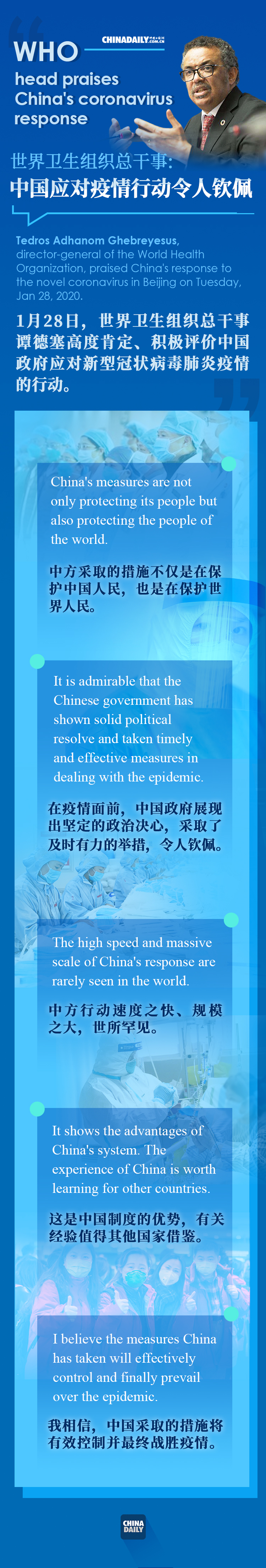 1月28日,世界卫生组织总干事谭德塞高度肯定、积极评价中国政府应对新型冠状病毒肺炎疫情的行动。