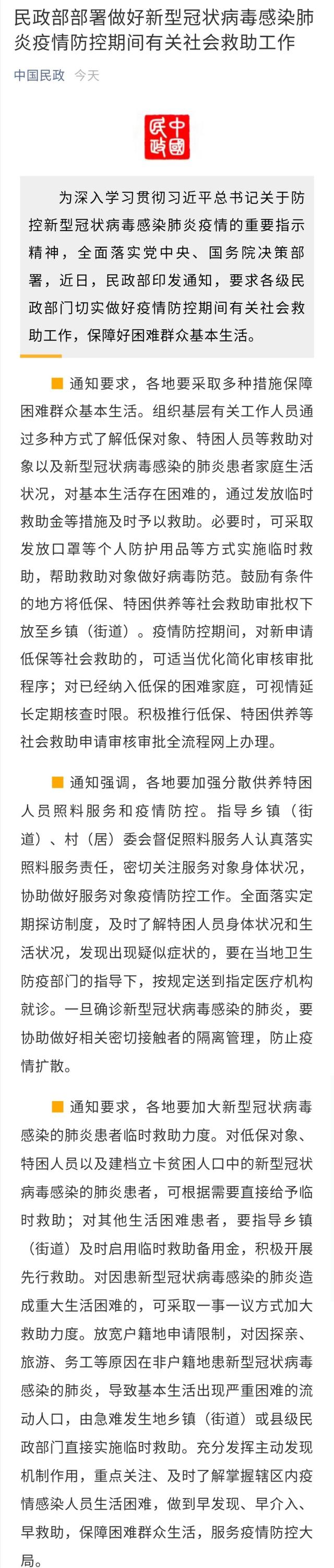 中新网客户端1月29日电(李金磊) 近日,民政部印发通知,要求各地要加大新型冠状病毒感染的肺炎患者临时救助力度。对低保对象、特困人员以及建档立卡贫困人口中的新型冠状病毒感染的肺炎患者,可根据需要直接给予临时救助;对其他生活困难患者,要指导乡镇(街道)及时启用临时救助备用金,积极开展先行救助。放宽户籍地申请限制,对因探亲、旅游、务工等原因在非户籍地患新型冠状病毒感染的肺炎,导致基本生活出现严重困难的流动人口,由急难发生地乡镇(街道)或县级民政部门直接实施临时救助。