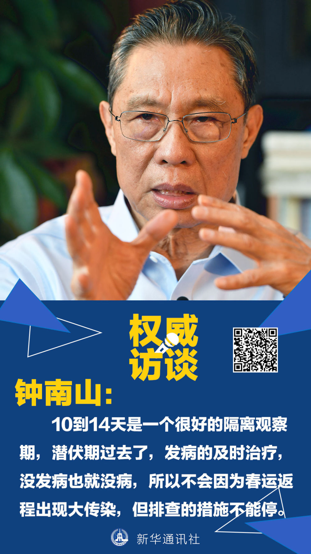 钟南山:返程春运涉及差不多千万人数回流。但我不觉得返程春运是一个很大的问题。因为外头过春节了,如果延长几天假期,就超过14天了,要感染病毒的话,有病就有了,在当地治疗了,没感染也就没有了。