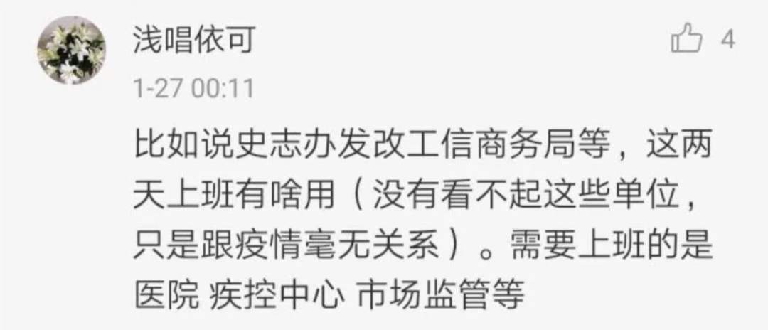 1月26日,中央应对疫情工作领导小组已经决定,采取适当延长春节假期、调整学校开学时间、支持网上办公等措施,减少人员流动,这才是积极而科学的应对措施,希望一些地方和单位能领会落实好。