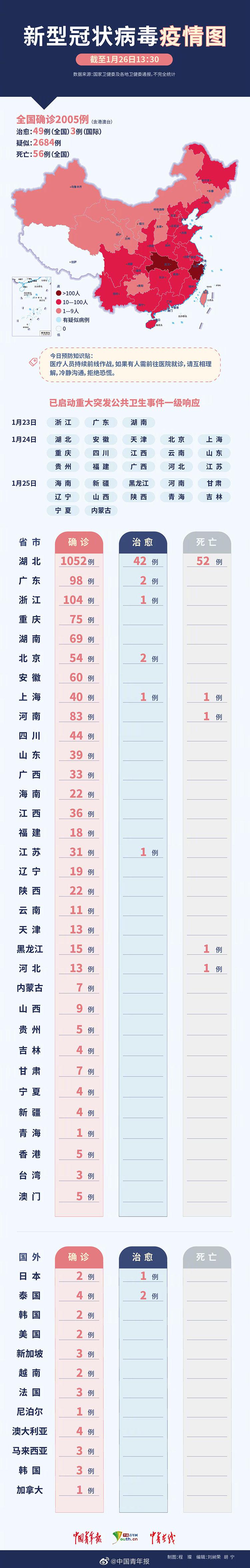 截至 1 月 26 日 13 时,据国家卫健委及各地卫健委公开信息,全国(含港澳台)累计报告确诊病例 2005 例,出院 49 例,死亡 56 例,疑似 2684 例。浙江成为第二个确诊病例超过 100 人的省份。