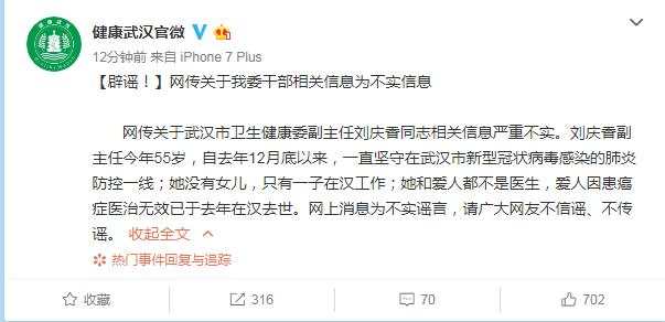 网传关于武汉市卫生健康委副主任刘庆香同志相关信息严重不实。刘庆香副主任今年55岁,自去年12月底以来,一直坚守在武汉市新型冠状病毒感染的肺炎防控一线;她没有女儿,只有一子在汉工作;她和爱人都不是医生,爱人因患癌症医治无效已于去年在汉去世。网上消息为不实谣言,请广大网友不信谣、不传谣。