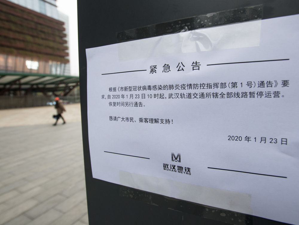 1月23日在武汉地铁汪家墩站出口拍摄的地铁停运通告(新华社记者 肖艺九 摄)