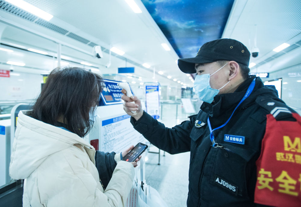 1月23日上午9时许,在武汉地铁8号线汪家墩站,工作人员对旅客进行体温检测。(新华社记者 肖艺九 摄)