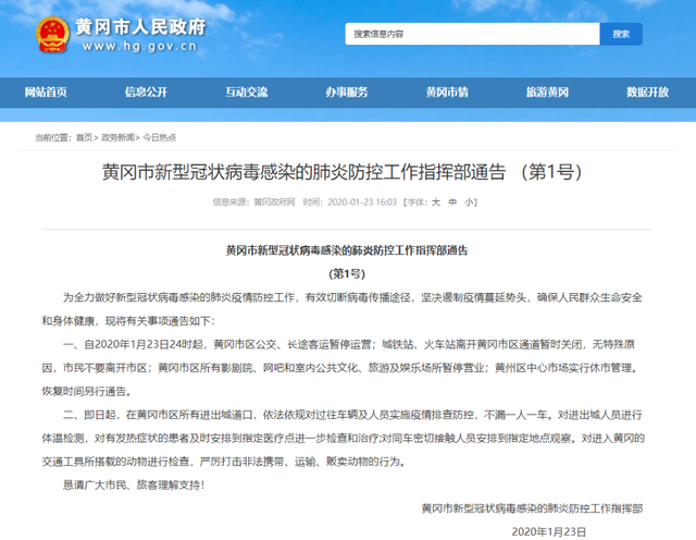 据黄冈市人民政府官网消息,1月23日,黄冈市新型冠状病毒感染的肺炎防控工作指挥部发布通告称,自2020年1月23日24时起,黄冈市区公交、长途客运暂停运营;城铁站、火车站离开黄冈市区通道暂时关闭,无特殊原因,市民不要离开市区;黄冈市区所有影剧院、网吧和室内公共文化、旅游及娱乐场所暂停营业;黄州区中心市场实行休市管理。恢复时间另行通告。