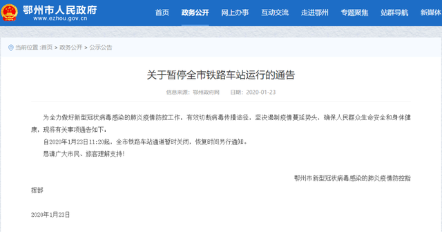 据湖北省鄂州市政府网站消息,鄂州市新型冠状病毒感染的肺炎疫情防控指挥部23日发布关于暂停全市铁路车站运行的通告。
