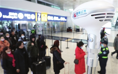 1月21日,在武汉天河机场,工作人员对旅客进行体温检测。新华社 图
