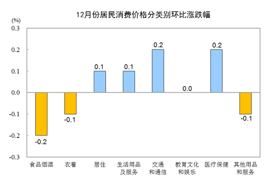 12月份,全国居民消费价格环比持平。其中,城市持平,农村下降0.1%;食品价格下降0.4%,非食品价格上涨0.1%;消费品和服务价格均持平。