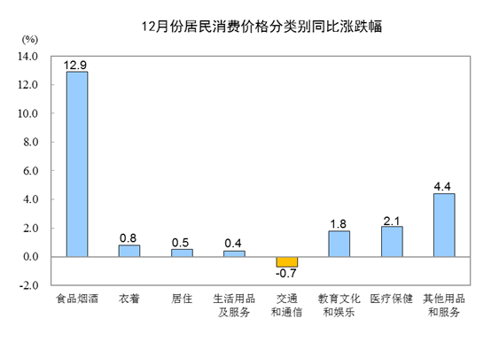 12月份,食品烟酒类价格环比下降0.2%,影响CPI下降约0.05个百分点。食品中,蛋类价格下降4.7%,影响CPI下降约0.03个百分点;畜肉类价格下降3.8%,影响CPI下降约0.28个百分点,其中猪肉价格下降5.6%,影响CPI下降约0.27个百分点;鲜菜价格上涨10.6%,影响CPI上涨约0.25个百分点;鲜果价格上涨0.6%,影响CPI上涨约0.01个百分点。