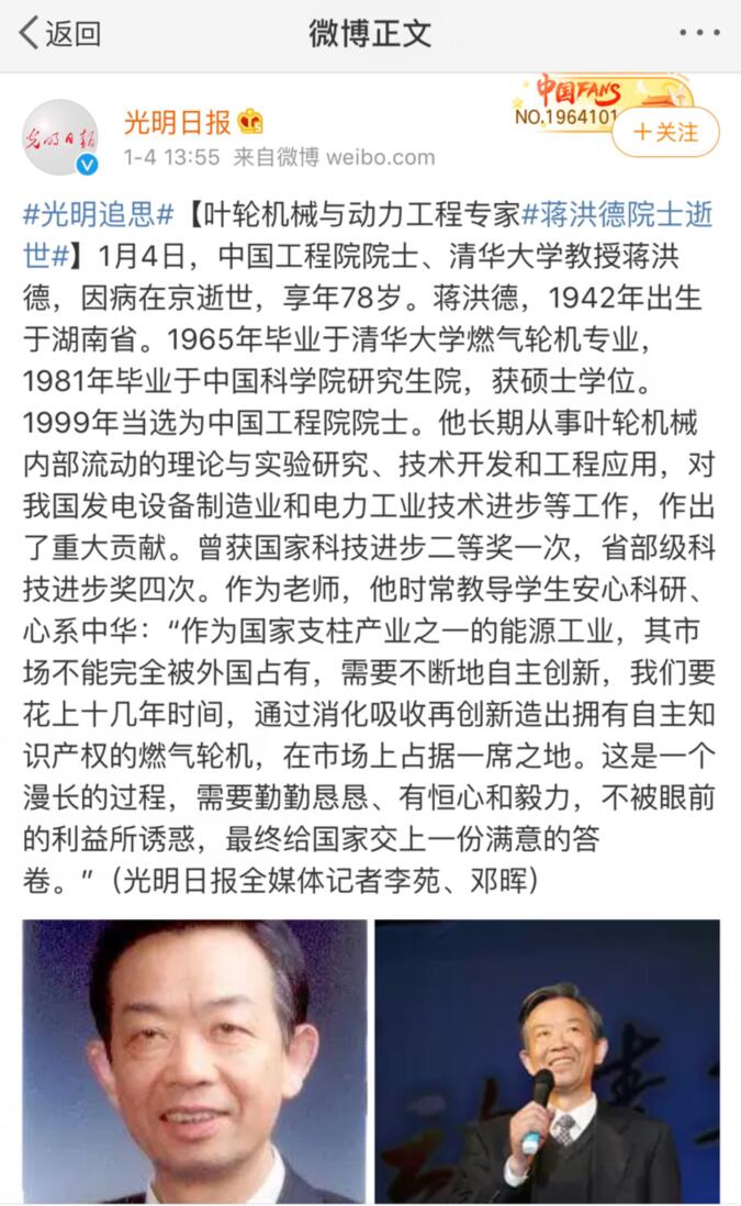 叶轮机械与动力工程专家蒋洪德院士逝世 出生于湖南